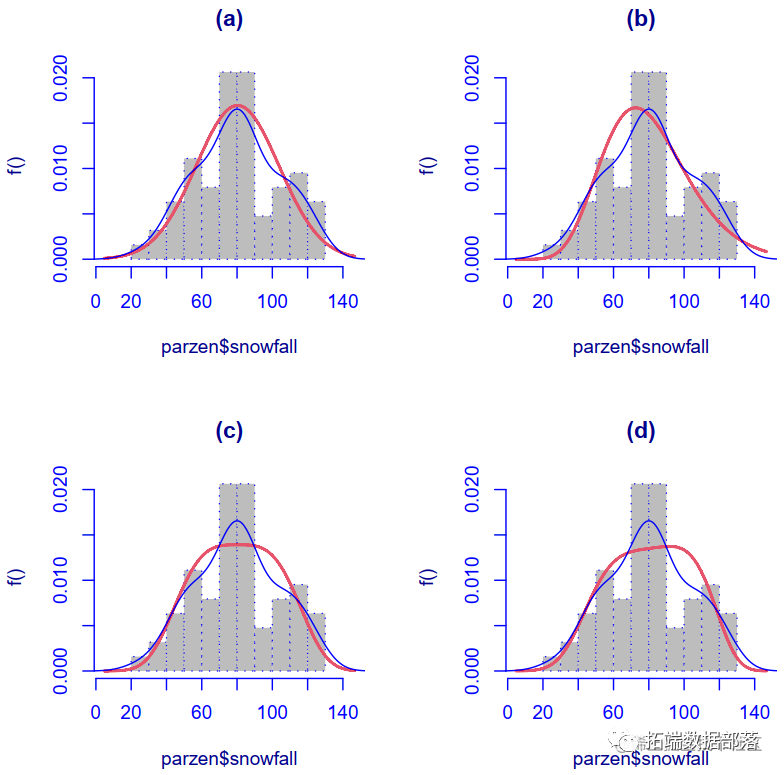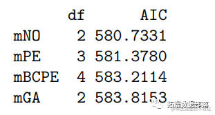 GAIC()函数的默认惩罚是k=2,Akaike信息准则(注意,我们可以使用等价函数AIC())。AIC准则表明,正态分布与数据完全吻合。图显示了四个不同的分布。