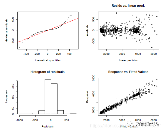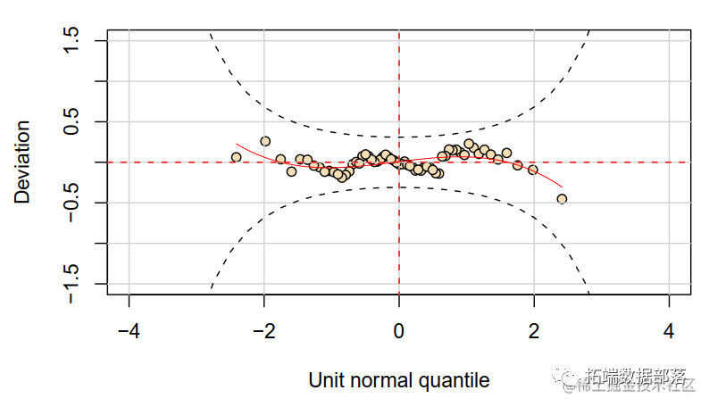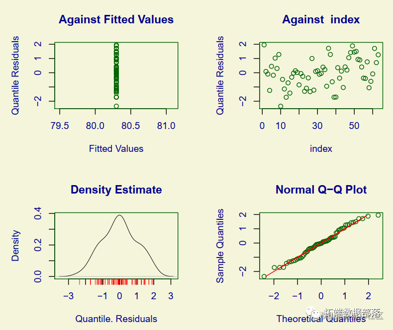 使用R函数ks.test()提供的Kolmogorov-Smirnovness拟合测试测试正态模型(或任何其他模型)的充分性在这里是不可取的,因为我们必须估计分布参数u和o,所以测试无效。(归一化分位数)残差的检验将提供一种研究适配适足性的方法。归一化分位数残差是独立的标准正态变量。我们期望拟合的(归一化分位数)残差I;近似地表现为正态分布的变量(即使最初的观测值Y不一定是正常的),因此残差的归一化Q-Q图在这里是合适的。r软件提供了用于绘制QQ-绘图的函数。