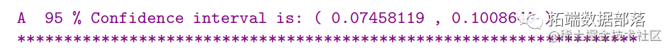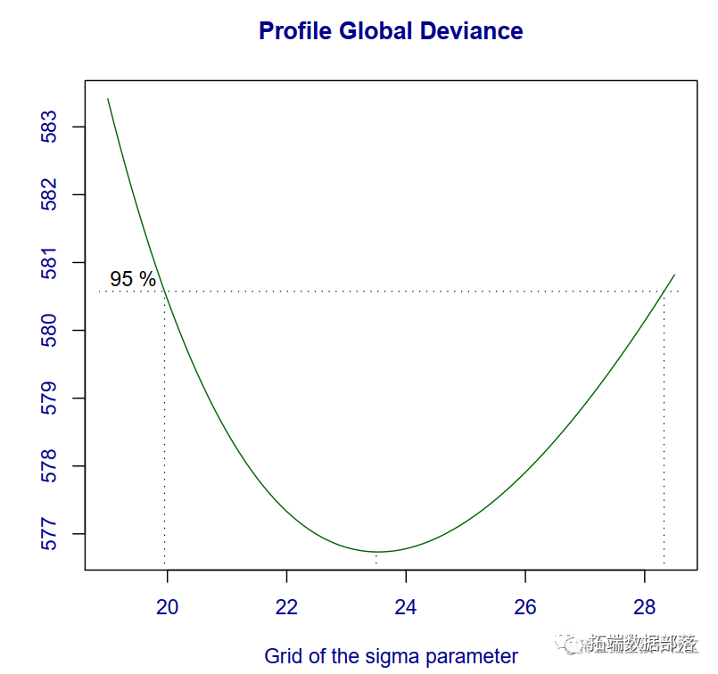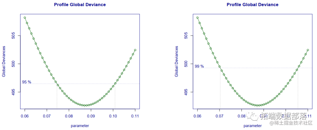 如我们所见,95%的剖面偏差置信区间为(0.0746,0.1009),与近似的(0.0769,0.0980)相差不远。