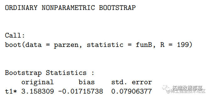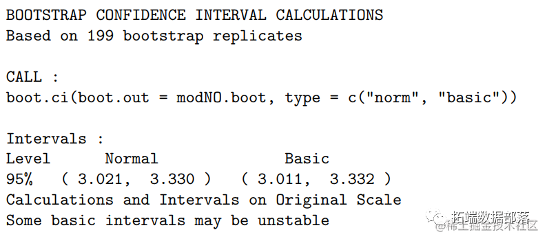 使用vcov()结果,log(O)=Bo2的95%置信区间(CI)为[3.158-(1.960.08922),3.158+(1.960.08922)]=(2.983,3.333),由此[exp(2.983),exp(3.333)]=(19.75,28.02)给出了o的95%CI置信区间。可以与图中的剖面偏差区间(19.96,28.32)进行比较,得到了用下列R脚本得到的[exp(3.021),exp(3.33)]=(20.51,27.93)所给出的自举CI。