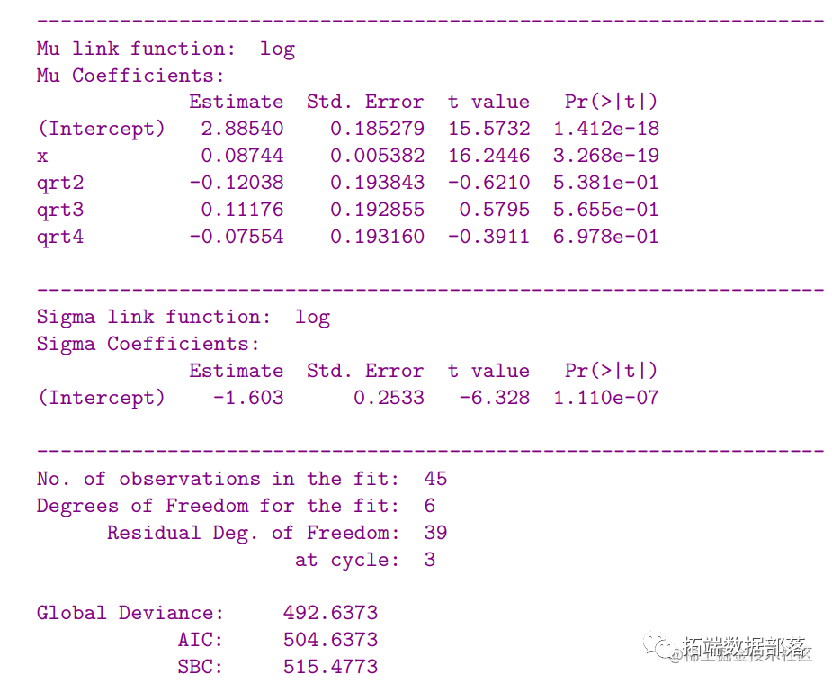 为模型中的任何参数提供概要偏差,而不仅仅是对于分布参数。让我们首先假设我们有兴趣拟合一个线性的时间项(X)加上季度季节效应的一个因子,QRT,使用负二项式模型(I型)家族。这个模型被拟合为