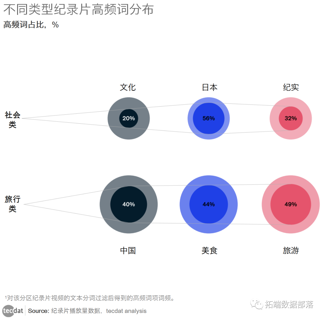 图中显示了社会和旅游纪录片文本中的12个高频词。其中,"旅游 "以1118次排名第一,与 "旅游 "相关的 "旅游 "和 "旅游摄影 "分别排名第4和第6位。"食品 "以1111次排名第二,与 "食品 "相关的 "食品 "排名第11。"人文 "以607次排名第五,而与之相关的 "纪录片 "则排名第八。