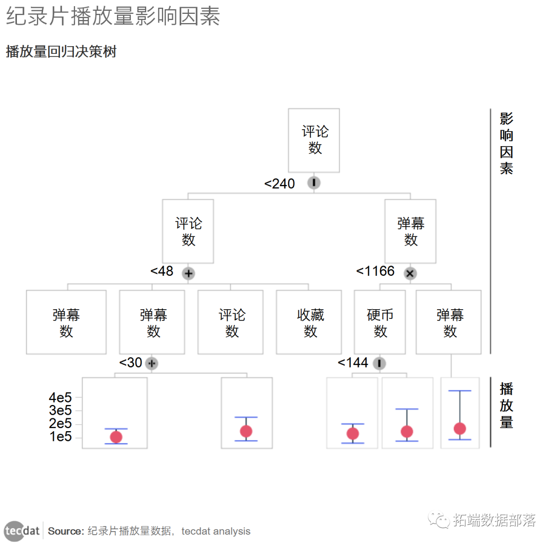 接下来,我们研究变量对播放量的影响。回归树模型被用来确定自变量对播放量的影响程度。