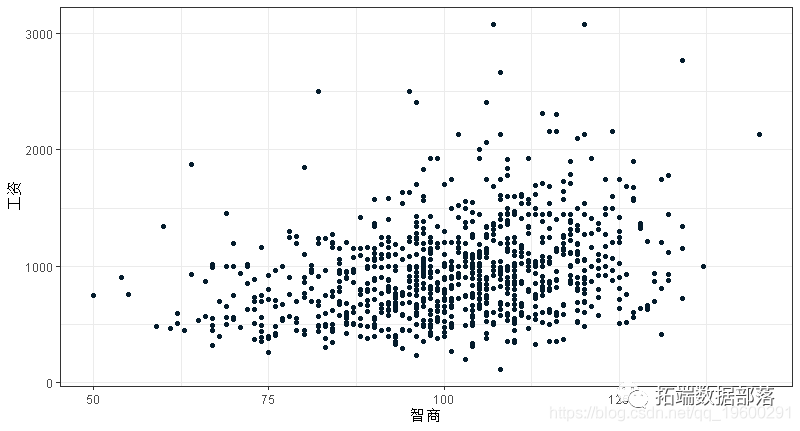 对于我们在数据中看到的工资差异,一个可能的解释是,更聪明的人赚更多的钱。下图显示了周工资和智商得分之间的散点图。