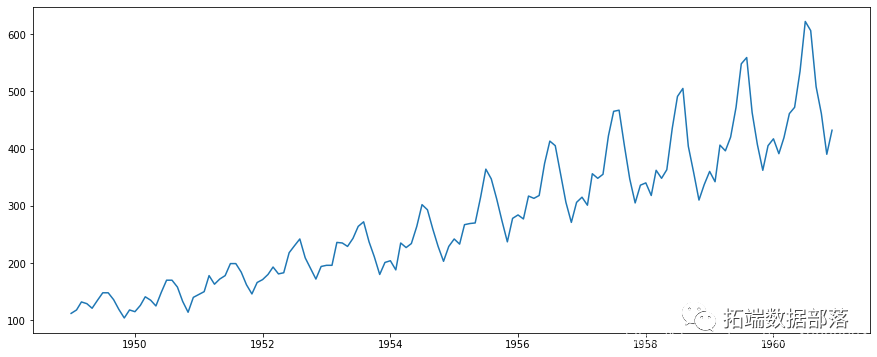 由于其固有的特性,对其进行分析涉及到各种步骤。下面将详细讨论这些问题。让我们从在Python中加载一个TS对象开始。我们使用航空乘客数据。