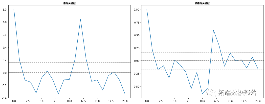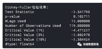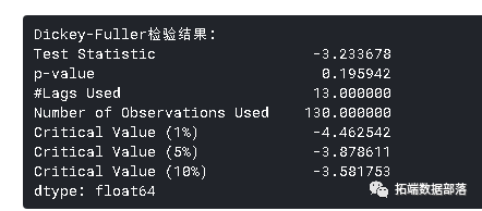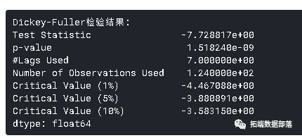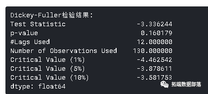 Dickey-Fuller检验:这是检验平稳性的统计检验之一。这里的零假设是TS是非平稳的。检验结果包括检验统计量和不同置信水平的一些临界值。如果“检验统计量”小于“临界值”,我们可以拒绝零假设并说序列是平稳的。