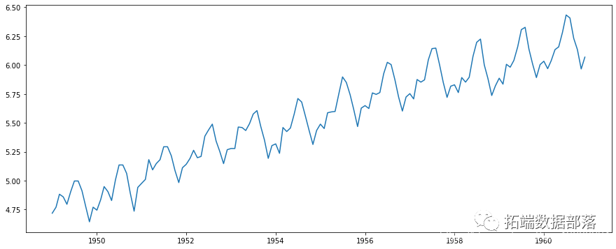 减少趋势的第一个技巧之一可以转换。例如,在这种情况下,我们可以清楚地看到存在显着的增长趋势。因此,我们可以应用转换,以惩罚更高的值,而不是较小的值。这些可以取对数,平方根,立方根等。在此处取对数转换简便简单: