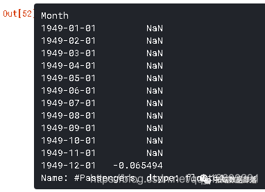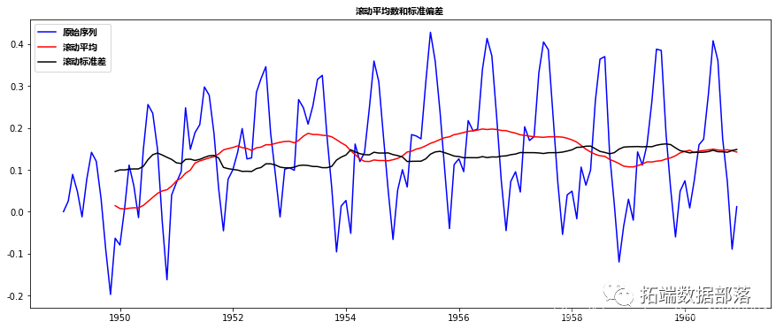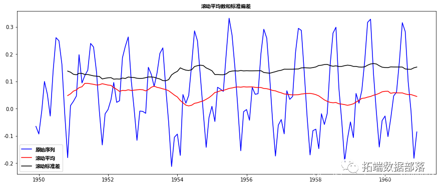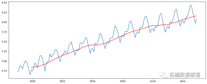 红线表示滚动平均值。我们从原来的数列中减去这个。注意,因为我们取最后12个值的平均值,所以滚动平均值没有定义前11个值。这可以观察到: