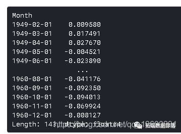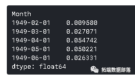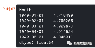 请注意,这些开始于'1949-02-01',而不是第一个月。为什么?这是因为我们取了一个滞后1,第一个元素之前没有任何东西可以减去。将差分转换为对数刻度的方法是将这些差分连续地添加到基数上。一个简单的方法是首先确定索引处的累积和,然后将其添加到基数中。累积总和如下所示: