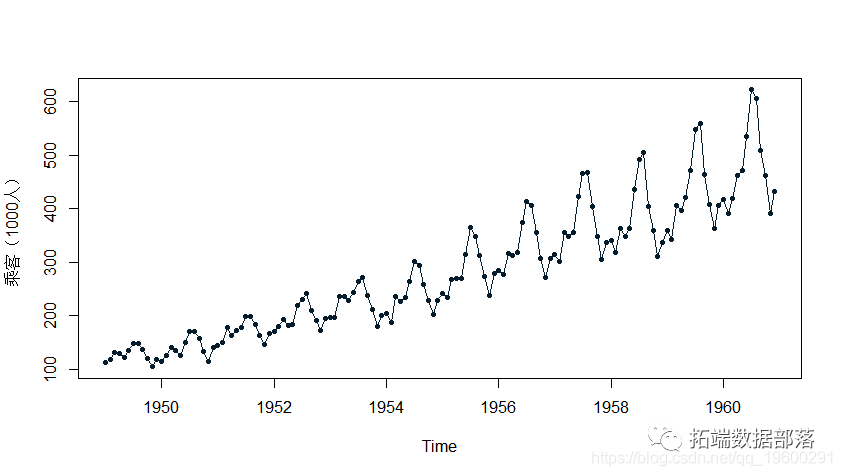 plot(tsdata, ylab="乘客(1000人)", type="o")