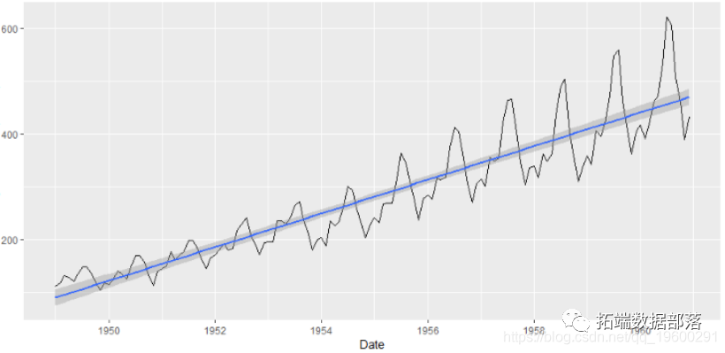 趋势-随时间变化的平均值。例如,在这个例子中,我们看到平均而言,乘客人数随着时间的推移而增长。