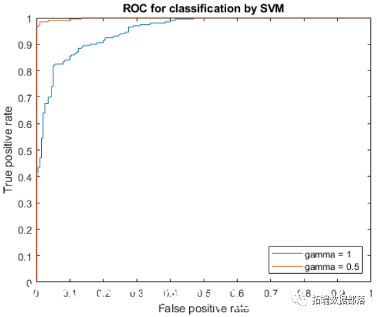伽玛设置为0.5时曲线下的面积大于伽玛设置为1时曲线下的面积。这也证实了伽玛参数值为0.5会产生更好的结果。为了直观比较这两个伽玛参数值的分类性能。
