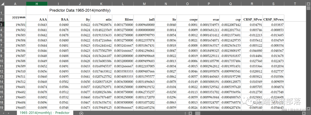 因变量y是股权溢价(equity premium),公式是equity premium=rm(t)-rf(t) 关于rm(t): rm(t)=log[Rm,t]=log[ (P(t)+D(t)) P(t-1) ],D(t)就是表格中的Dividend.