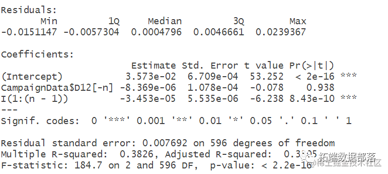 oequity_premium[-1] ~ CampaignData$D12[-n] +I(1:(n-1)), data=CampaignData)