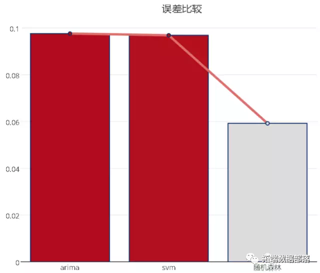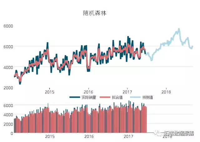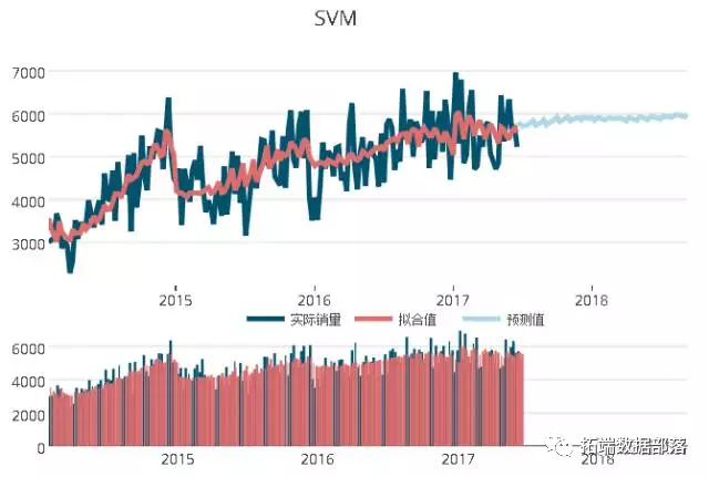 从上图可以看出,在此案例中,支持向量机和随机森林算法模型的预测误差最小,运用3种方法预测某商品的销量,其可视化图形如下:
