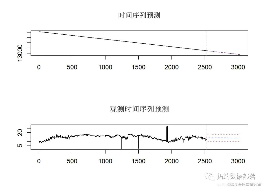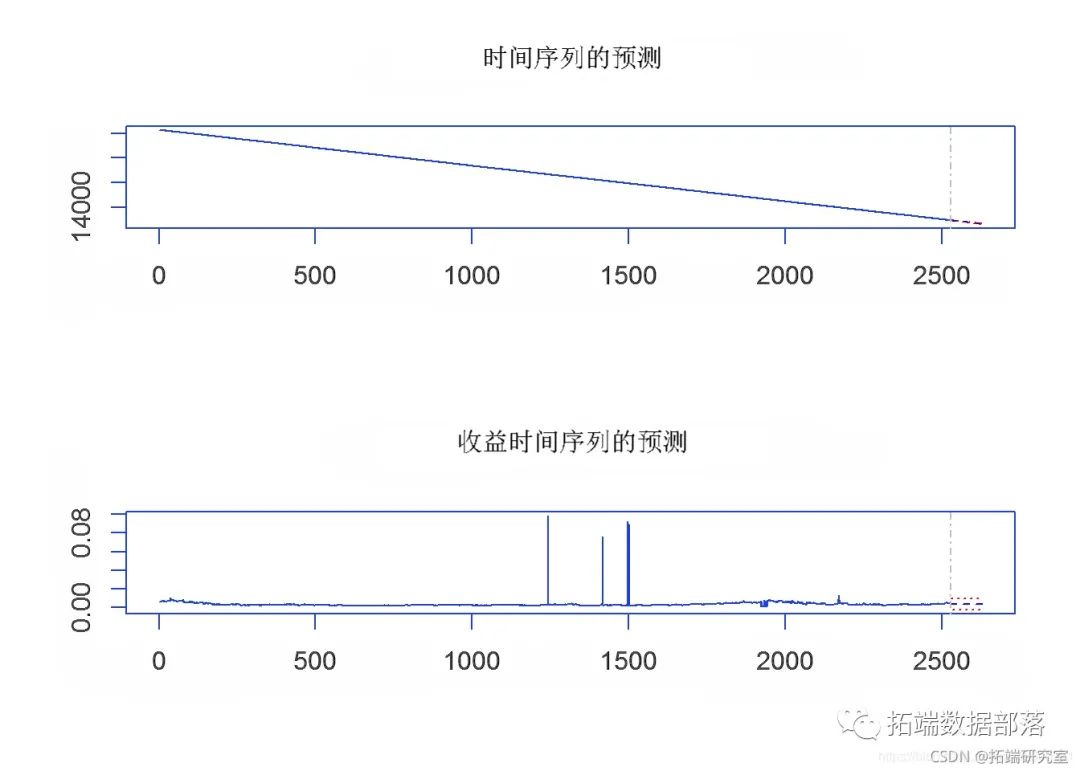 为了开始估算数据所隐含的未来事件,我们进行了初步的风险值估算。首先,所有行的平均值和日期信息的数据框架被转换为时间序列格式,然后从这个时间序列中计算出风险值。根据VaR计算对未来100天和500天的价值进行预测。在随后的预测图中,蓝色圆圈代表未来100天的数值,红色圆圈代表500天的回报值。