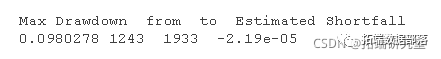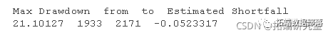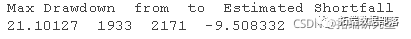 为便于比较,计算了10只股票指数数据的条件风险值(CvaR或估计亏损)。首先,利用数据的时间序列,找到最差的0.95%的跌幅的最大值。然后,通过 "高斯 "方法计算出估计亏损,这两种计算的结果都以表格形式呈现。