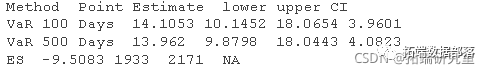 最后,给出了 10 个股票指数 MLE 未来价值的估计结果表。3 个 MLE VaR 估计值(和 MLE 期望损失ES)的点估计值和范围被制成表格来比较。