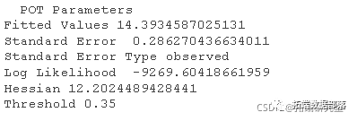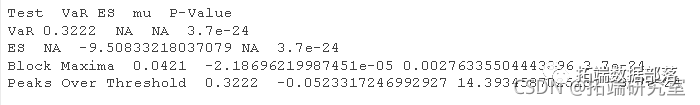 下表汇总了检验 极值分布的 10 个股票的四种方法的结果。第一列包含四种估计方法的名称。提供了 VaR、ES、mu统计量和 Anderson-Darling P 值的统计量。