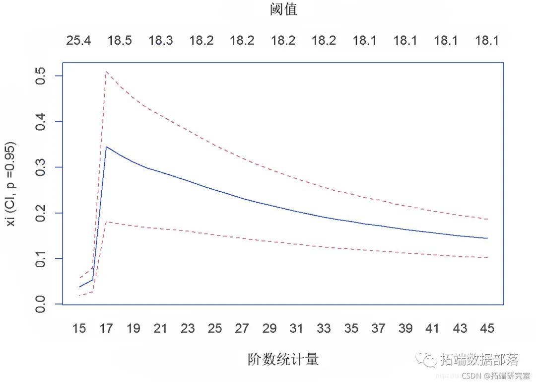 由于假设10股指数数据为重尾分布,数据极少变化,所以采用Hill Estimation对尾指数进行参数估计。目的是验证 10 只股票数据是否为极值分布。Hill Estimation 生成的图证实了。