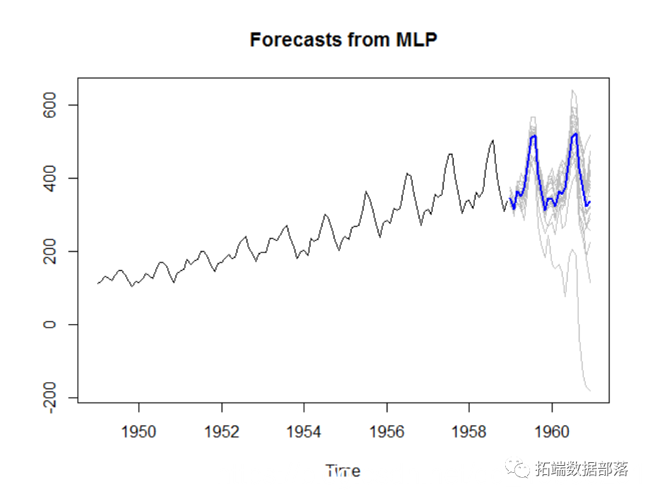 这是使MLP网络适合时间序列的基本命令。这将尝试自动指定自回归输入和时间序列的必要预处理。利用预先指定的参数,它训练了20个用于生成整体预测的网络和一个具有5个节点的隐藏层。print