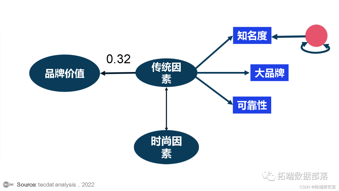 矩形用于表示属性,也称为测量变量、观察变量或清单变量。在此示例中,传统因素由知名度、大品牌_和_可靠性 属性表示或衡量。
