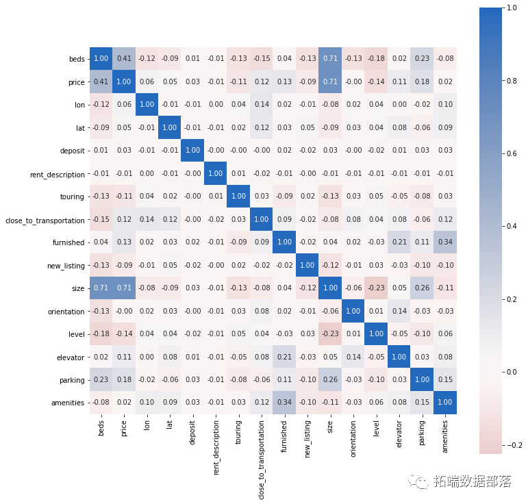 sns.heatmap(df_clean.corr(), square=True, annot=True, fmt = '.2f', cmap = 'vla