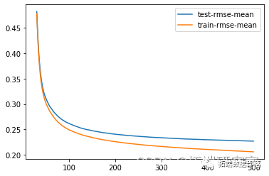 xgb_model.loc\[30:,\['test-rmse-mean', 'train-rmse-mean'\]\].plot();
