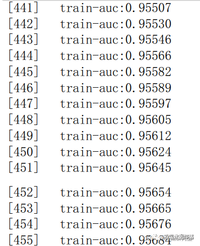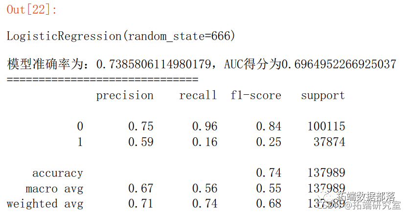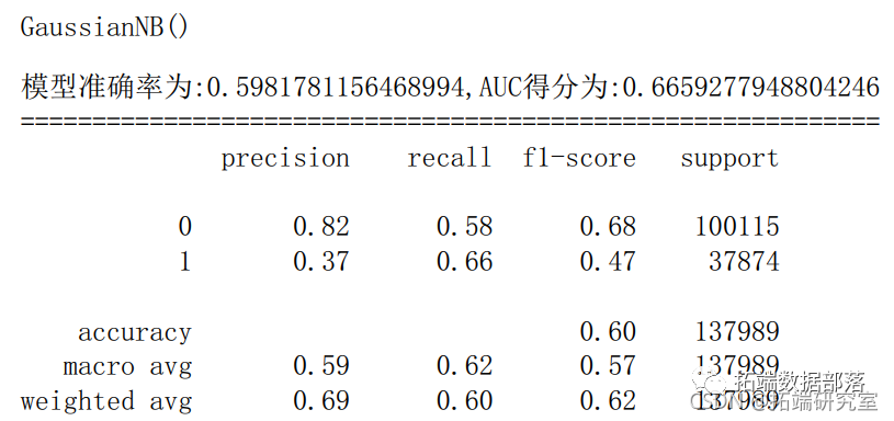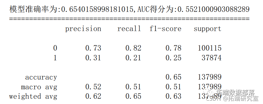 print('模型准确率为:{0},AUC得分为:{1}'.format(score\_xgb,auc\_xgb))