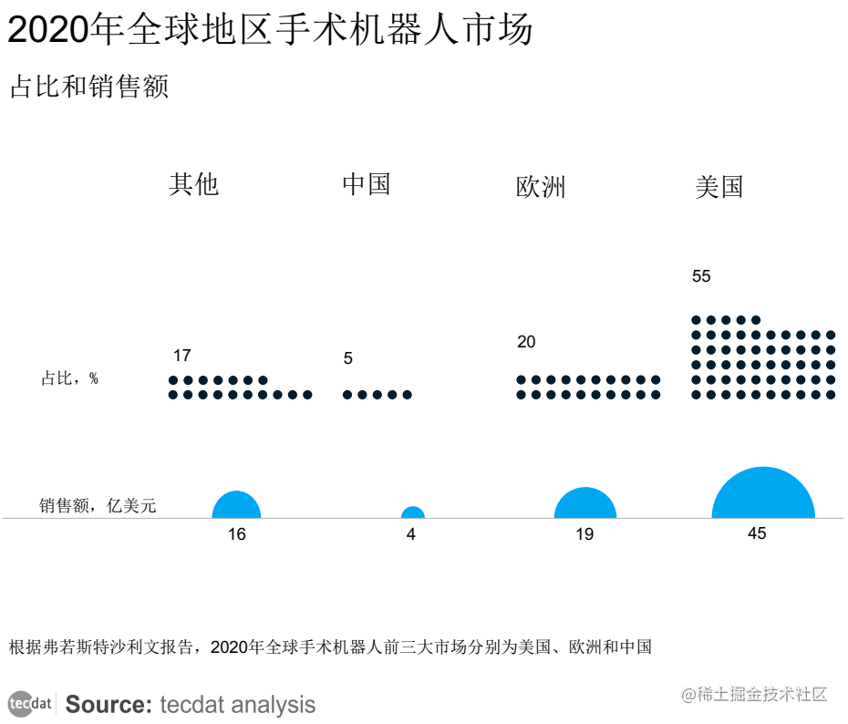 全球最大的手术机器人市场在美国。根据弗罗斯特·沙利文( Frost Sullivan )的分析,2020年中国、欧洲和美国将分别占全球前三大手术机器人市场(附原数据表)。