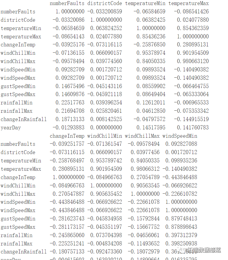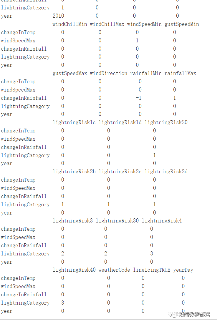 有显著的相关关系。从变量相关关系图和矩阵,可以看到temperatureMin和temperatureMax,windChillMin,windChillMax,以及gustSpeed和windSpeed之间,rainfall和changeInRainfall,以及lightningRisk和lightningCategory之间都有教明显的线性相关关系。yearDay和windChill之间也有一定的相关关系。