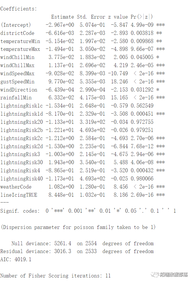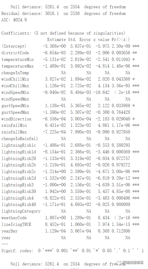 从逻辑回归结果来看,模型中部分自变量对因变量的影响较为明显,达到了0.01的显著性水平,具有一定的理论意义。然而从AIC的值来看,达到了4024.881,数值较大,说明模型的拟合度较差,有进一步改进的空间。一般认为计算条件数kappa(X),k<100,说明共线性程度小,如果1001000,存在严重的多重共线性。从结果来看,kappa值远远大于1000,因此判断该模型存在严重的共线性问题,即线性回归模型中的解释变量之间由于存在精确相关关系或高度相关关系而使模型估计失真或难以估计准确。changintemp,changinrainfall,windspeedmin,lightningcategory ,rainfallMax之间存在较高的相关关系会对模型的拟合失真并且难以用以估计和预测,因此,删掉这些变量后重新对模型进行拟合。删除部分共线性程度高的变量后可以看到模型的AIC降低了,因此,模型的拟合程度提高了。大部分样本的cook’ distance距离在正常范围内,392,624,622号样本的cook’ distance较大,可能会对模型产生较大的影响。