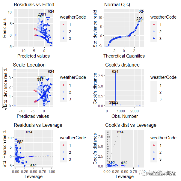 从模型中变量的VIF值来看,大多数变量之间不存在较强的多重共线性关系。从残差拟合图来看,大部分样本拟合值分布在0周围,说明拟合结果较理想。981,2331和524号样本可能为异常点。从正态分布qq图来看,大部分点分布在图中直线附近。说明样本点服从正态分布。同样,拟合值的标准残差也分布在红线周围,说明拟合效果较好。同样,大部分样本的cook’ distance距离在正常范围内,392,624,622号样本的cook’ distance较大,可能会对模型产生较大的影响。