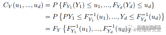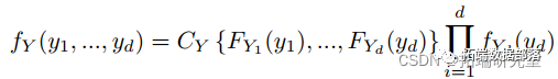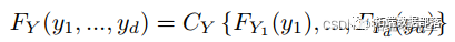 的 CDF 根据定义是一个 copula。使用 Sklar (1973) 的定理,然后我们可以将我们的随机变量 Y 分解为一个 copula CY ,它包含关于我们的变量 Y 之间相互依赖的信息,以及单变量边缘 CDFs FY ,它包含关于每个变量的所有信息单变量边缘分布。对于 d 维,我们有: