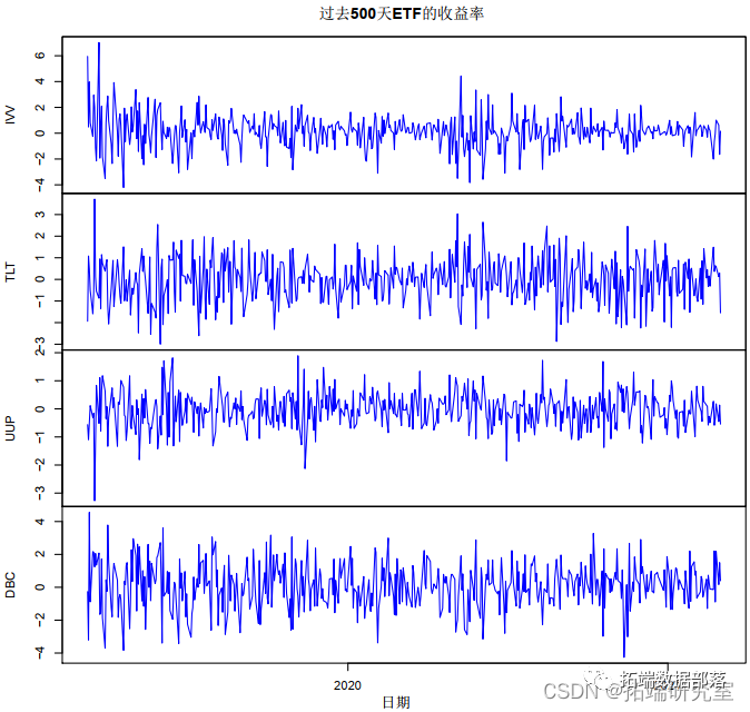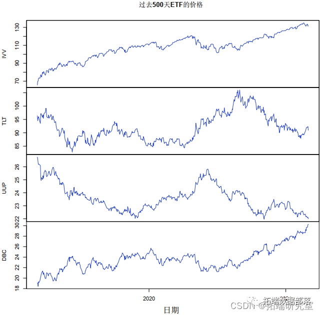 像往常一样,我们从读取文件开始。图 1 显示了价格图:注意 IVV 和 DBC(股票和商品)之间的关系以及 TLT 和 UUP(元和国债)之间的关系。
