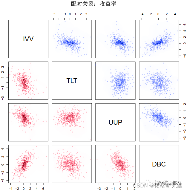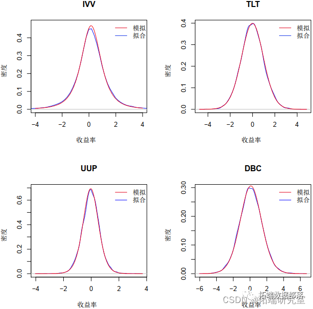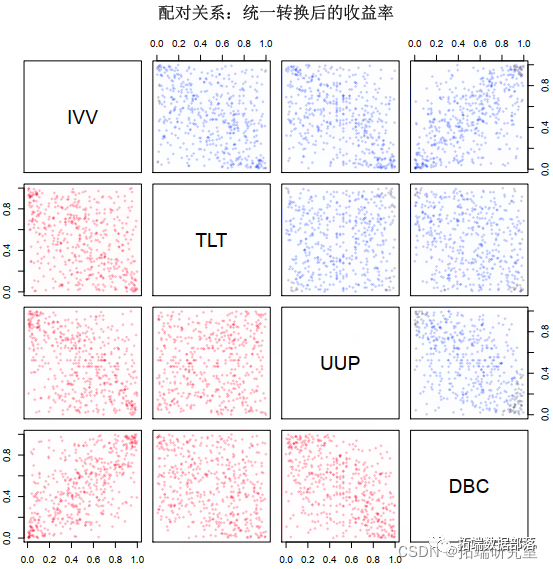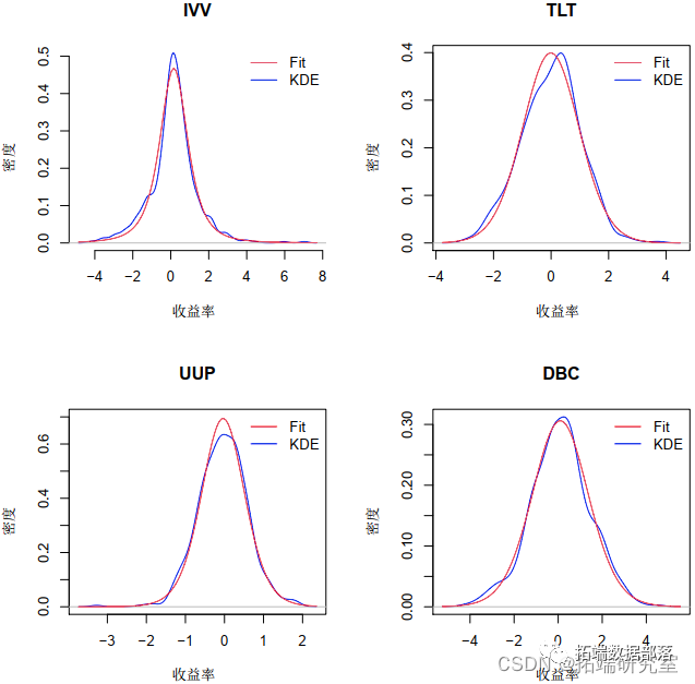 Copulas 对多元分布中变量之间的相关性进行建模。它们允许将多变量依赖关系与单变量边缘分布相结合,允许我们对构成多变量数据的每个变量使用许多单变量模型。Copulas 在 2000 年代开始流行。根据 Salmon (2009) 的说法,Li (2000) 最近提出的Copulas应用之一是 2008 年开始的金融危机。我们将使用 copulas 来模拟四个 ETF 基金的行为:IVV,跟踪标准普尔 500 指数;TLT,跟踪长期国债;UUP,追踪外汇指数;以及商品的 DBC