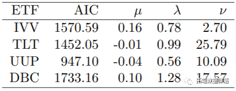 表 I 显示了 ETF 边缘 t 分布的估计参数和 AIC 的结果: