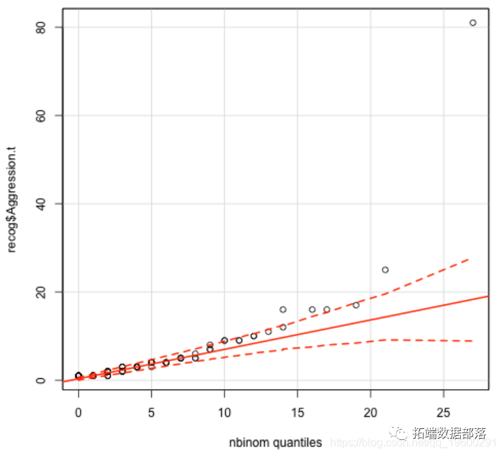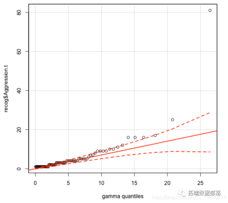 查看我使用qqp生成的图。y轴表示观测值,x轴表示通过分布建模的分位数。红色实线表示理想分布拟合,红色虚线表示理想分布拟合的置信区间。您想选择最大的观测值落在虚线之间的分布。在这种情况下,这就是对数正态分布,其中只有一个观测值落在虚线之外。现在,我可以尝试拟合模型。