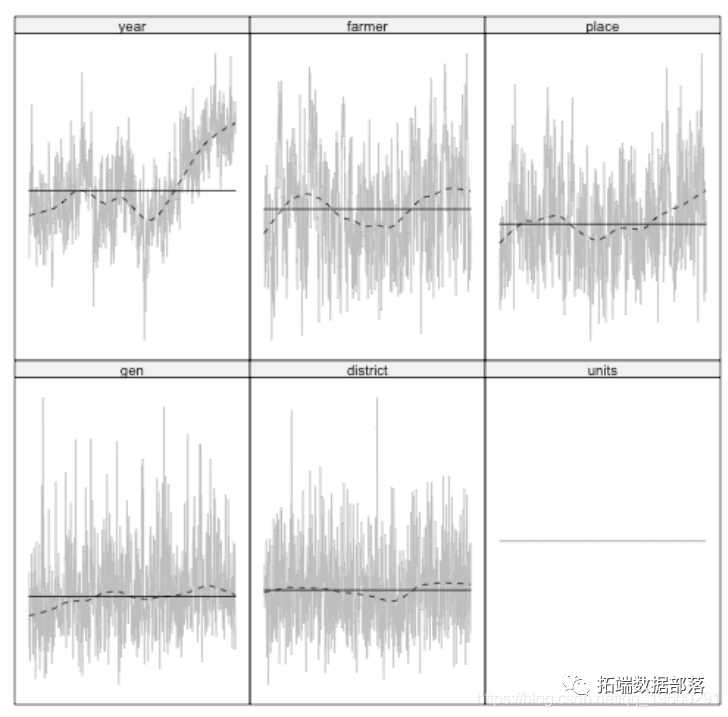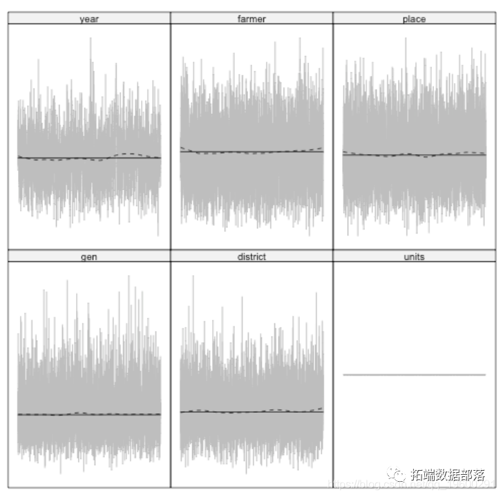 如果我们看一下均值和置信区间,我们可以看到,真正影响利润可变性的唯一随机效应是年份和基因型。也就是说,大麦收成获利的可能性每年之间以及基因型之间变化很大,但是在农民或地方之间变化不大。