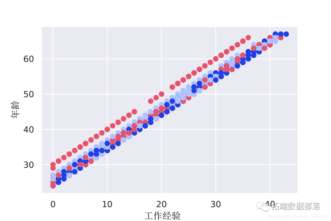 观察 上图显示与经验和年龄呈正相关。随着经验的增加,年龄也会增加。颜色也显示教育程度。四十多岁之间存在差距,大学以下的人也更多