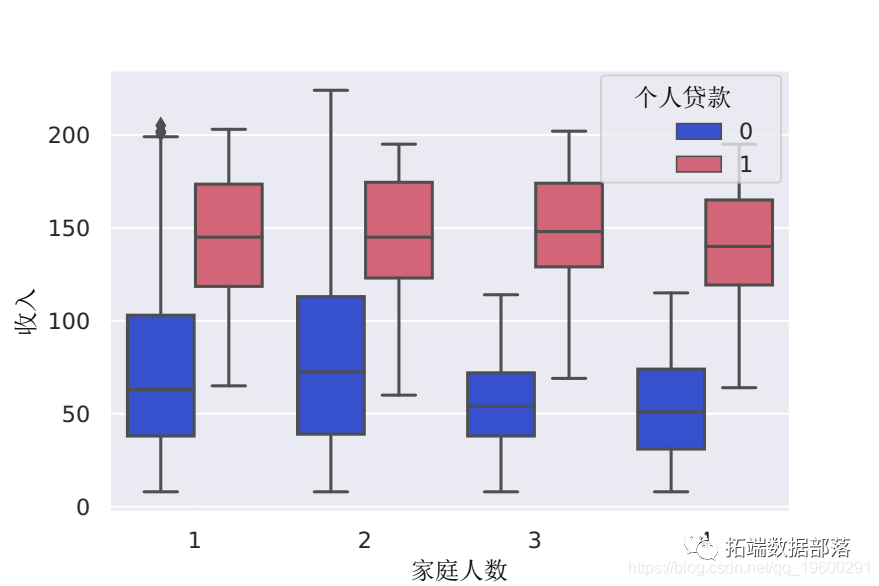 sns.boxplot看下面的图,收入低于10万的家庭比高收入的家庭更不可能获得贷款。