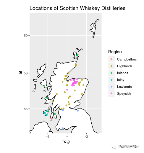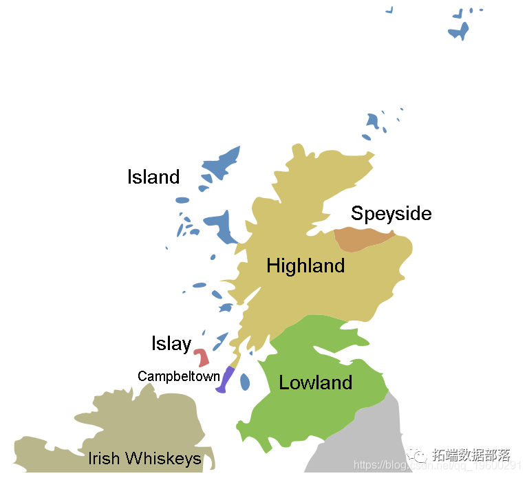 由于区域对威士忌起着重要作用,我们将通过绘制其纬度和经度来探索数据集中的酿酒厂所在的位置。以下苏格兰威士忌地区存在: