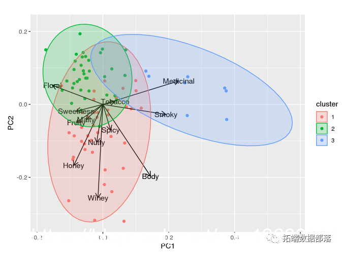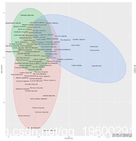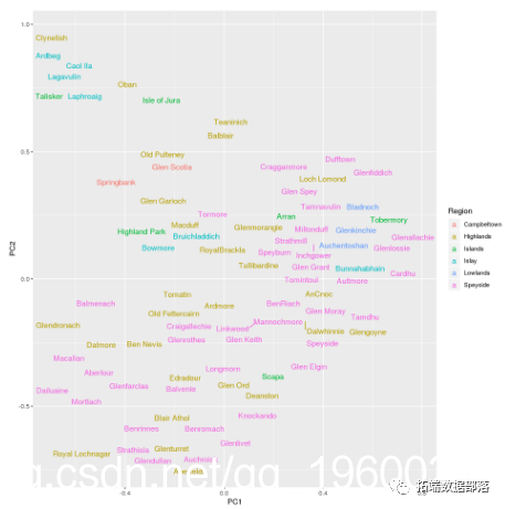 PC1表示味道的强度: 如烟熏味,药用味(如Laphroaig或Lagavulin)与温和味道(如Auchentoshan或Aberlour)