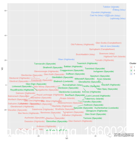 通过这种方式,问题减少到三个区域:Island Islay威士忌,Highland Lowland Campbeltown威士忌和Speyside威士忌。再次进行分析: