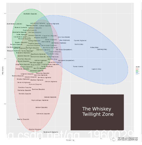 位于二维PCA空间右下方的威士忌将同时具有两种特性:它既复杂又烟熏。我猜这种具有两种特性的威士忌对于口感来说太好了。
