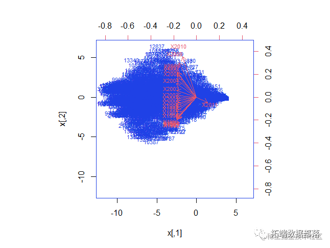 biplot(scores[,1:2], loadings[,1:2], xlab=rownames(scores),