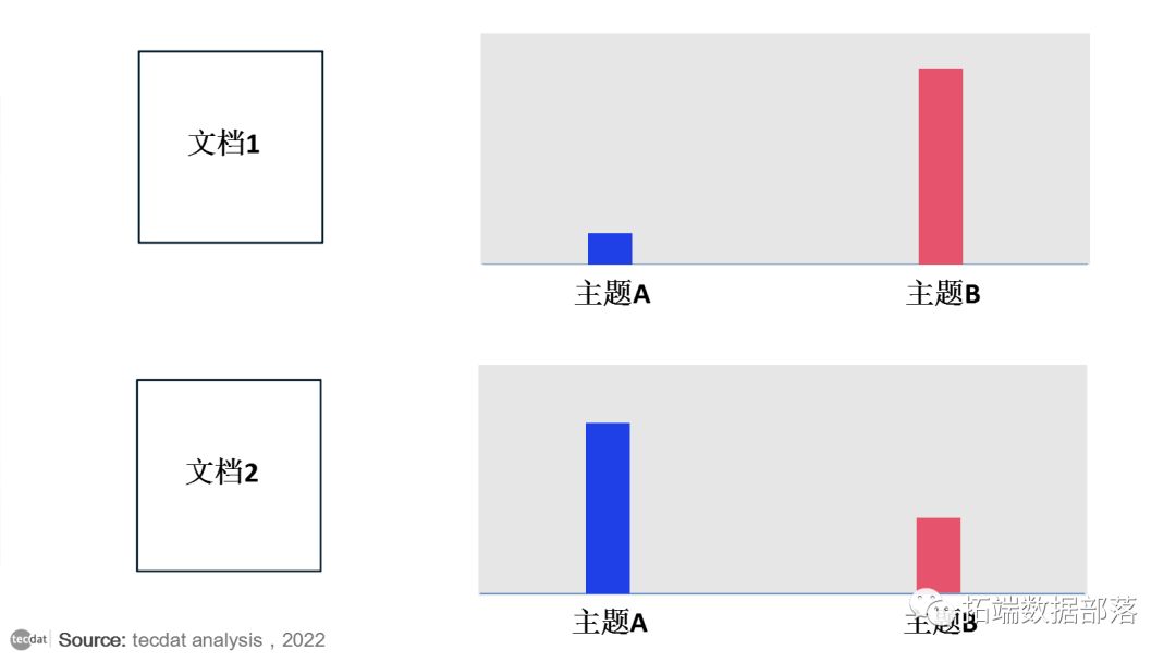 首先,每个文档都是主题的混合体。我们想象每个文档可能包含来自多个主题的特定比例的单词。例如,在双主题模型中,我们可以说“文档 1 是20%的主题A和80%的主题B,而文档2是70% 的主题A和30%的主题B”。