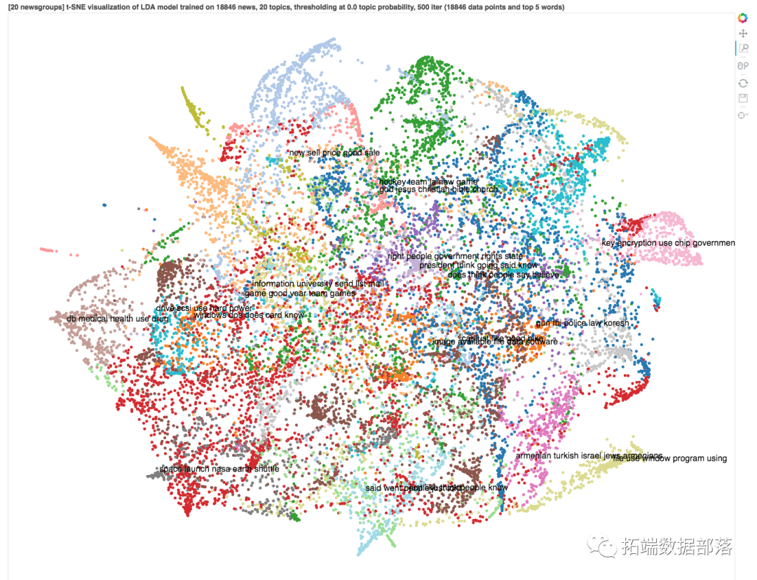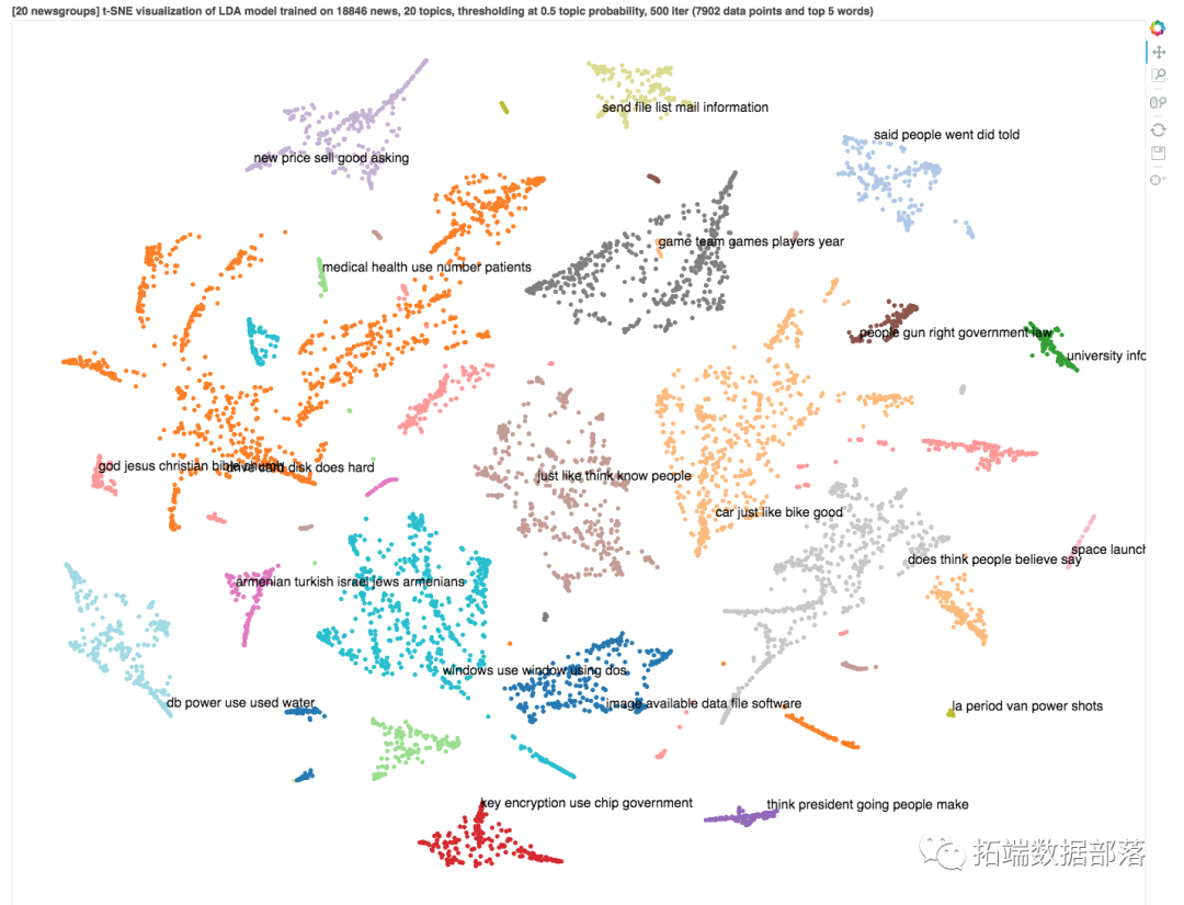 在本节中,我们将在20个新闻组数据集上应用LDA算法,以发现每个文档中的基础主题,并使用t-SNE将它们显示为组。