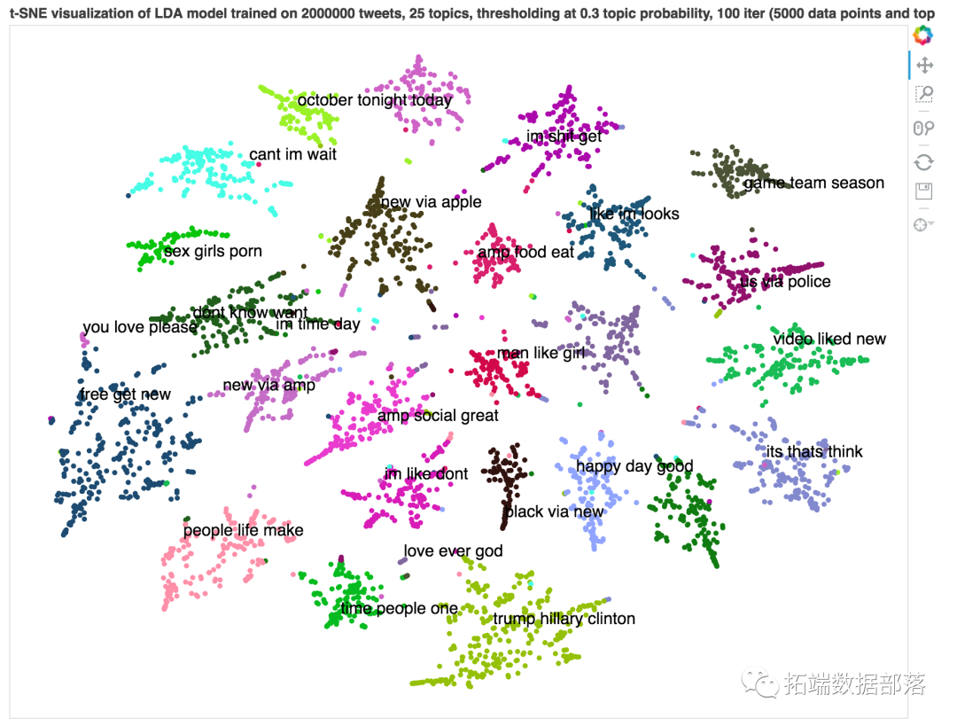 获得足够的推文后,我们可以加载推文,处理它们,对它们进行矢量化并计算tf-idf分数,训练LDA模型,减少到2-D,并可视化结果。请参阅此处的完整脚本。