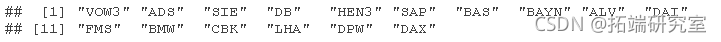 股票价格数据下载并读入 R 编程环境。收益率是用“开盘价/收盘价 ”计算的,十家公司的数据合并在一个数据框中,(每家公司一列)。
